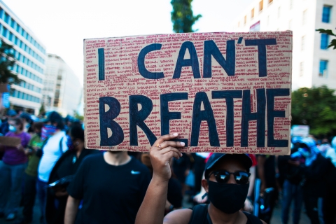officer kneeling on his neck and all the signs of the protestors with his cries